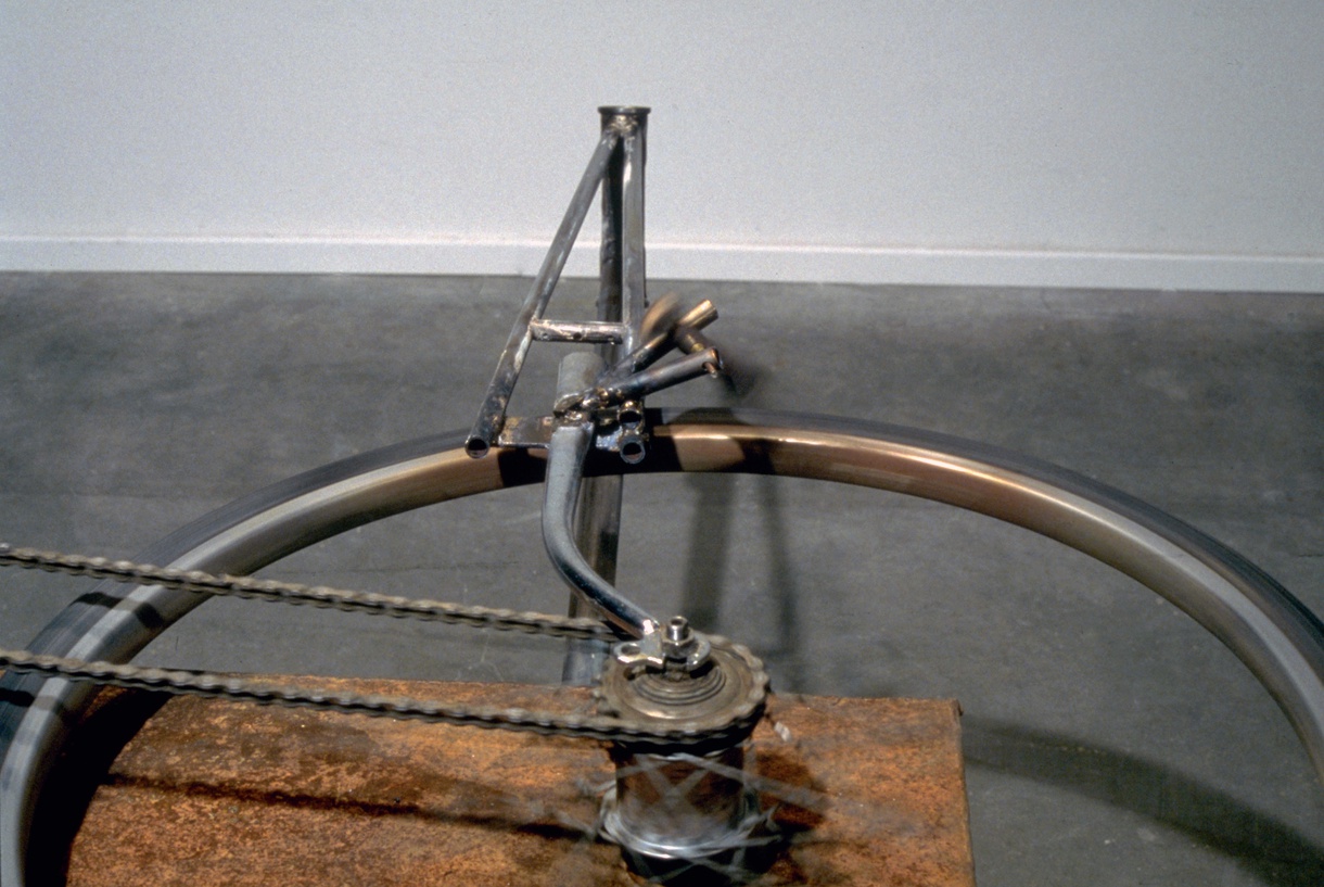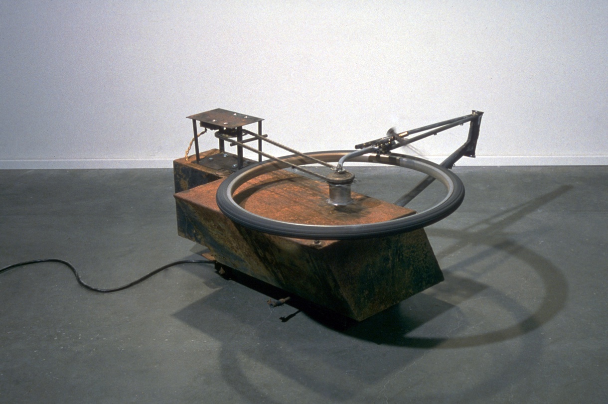 Old military gas tank, bicycle wheel, motor and bicycle frame. Dimensions: L30” x W27” x H17” After sitting in a basement for twenty-two years, the separate tones of out-of-true bicycle spokes were played.