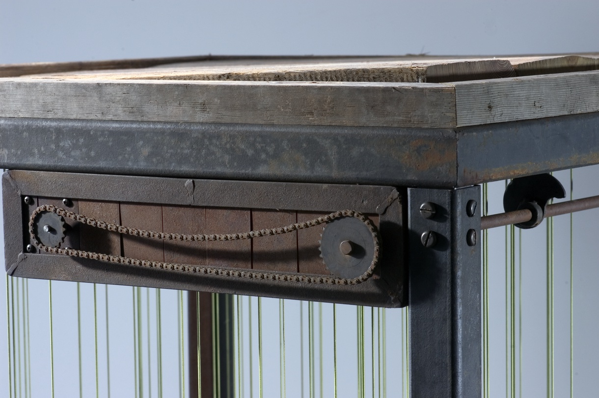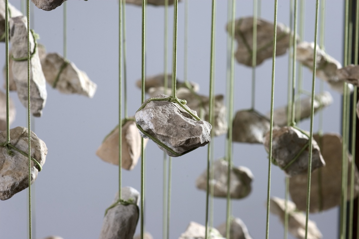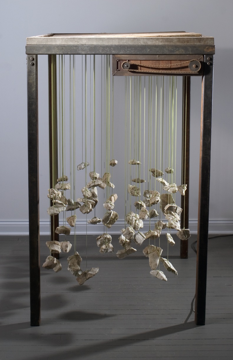 Medium: Found rocks from a pier, elastic, wood planks, steel and motor. Dimensions: L 48" x W 48" x H 66"