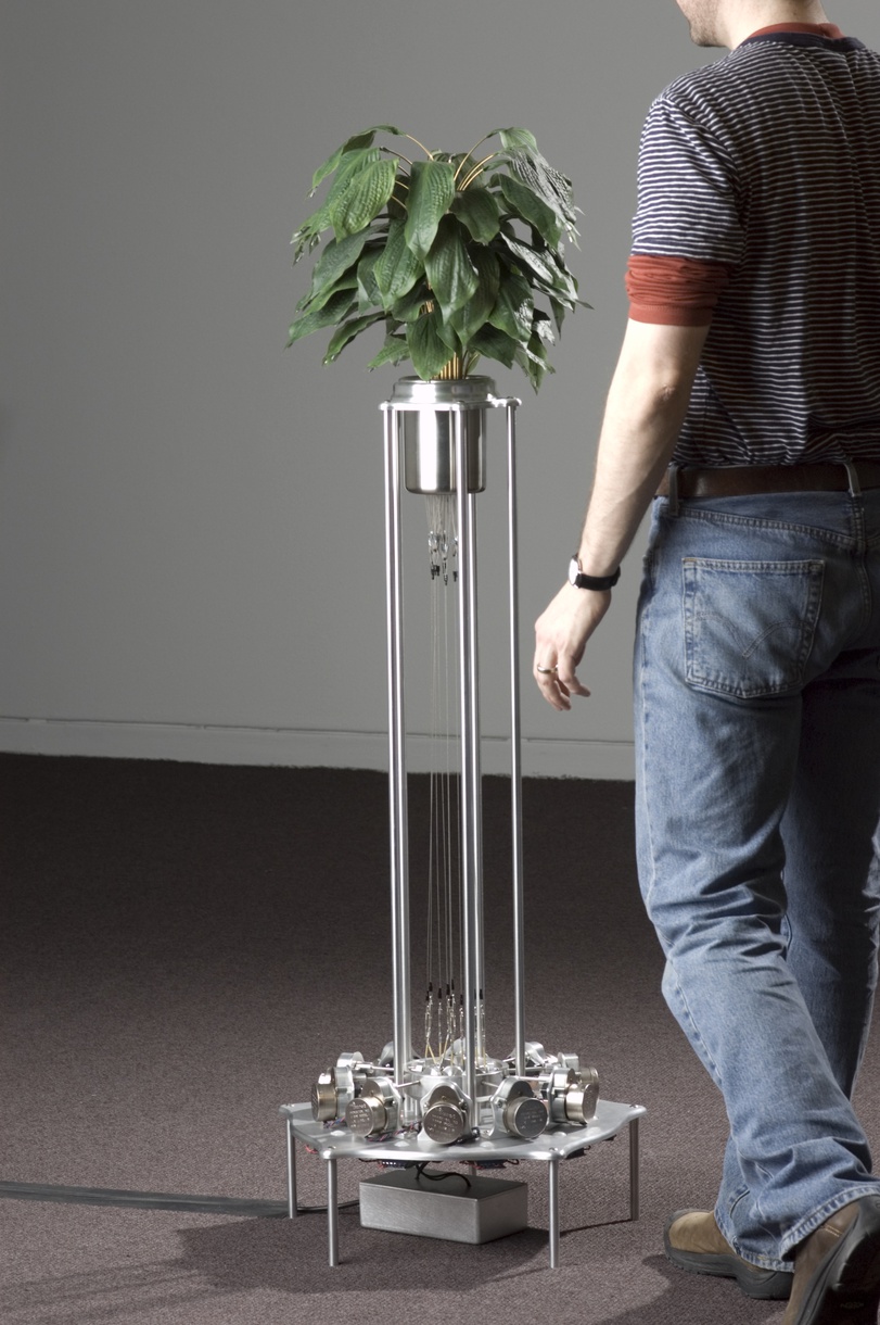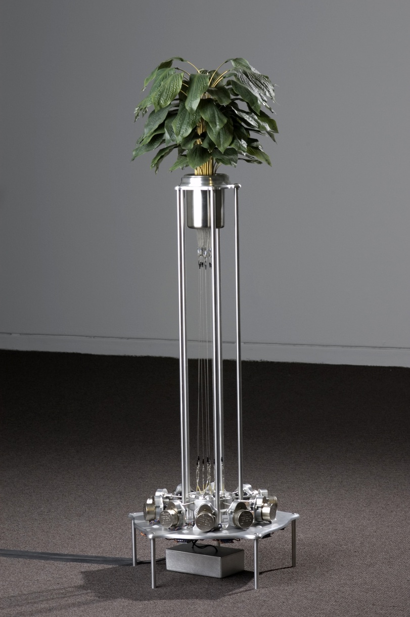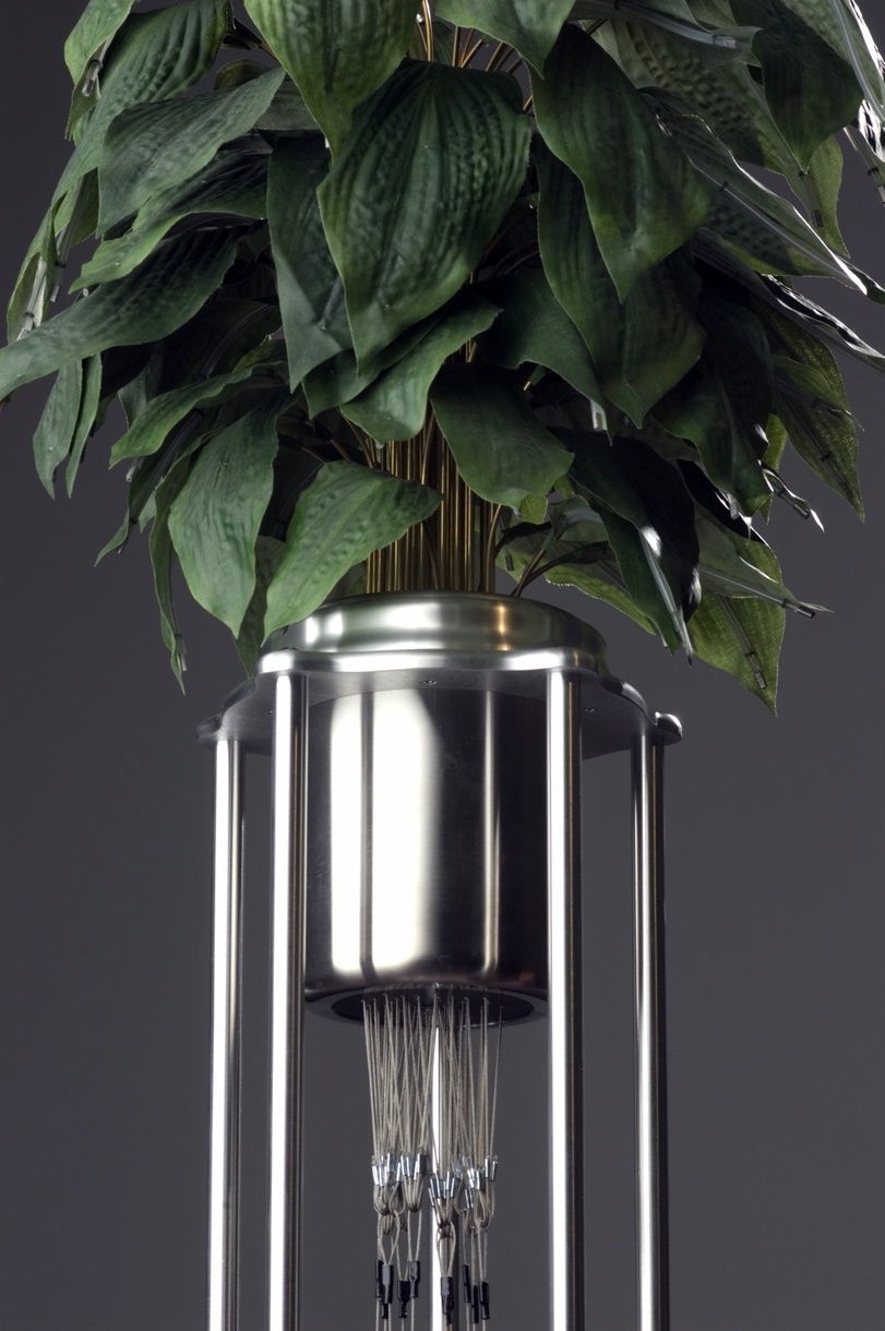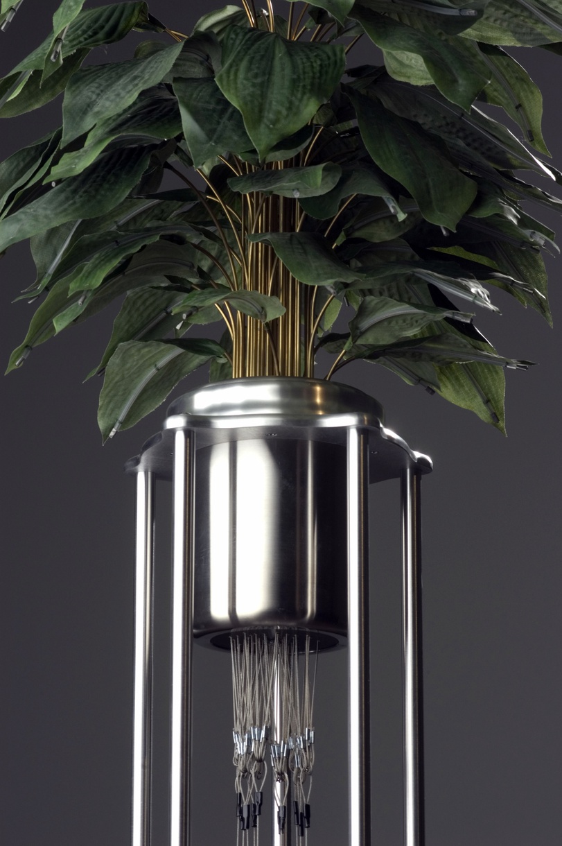 Medium: Artificial plant leaves, cables, metal, motors and motion sensors. Dimensions: L 23” x W 23” x H 52”