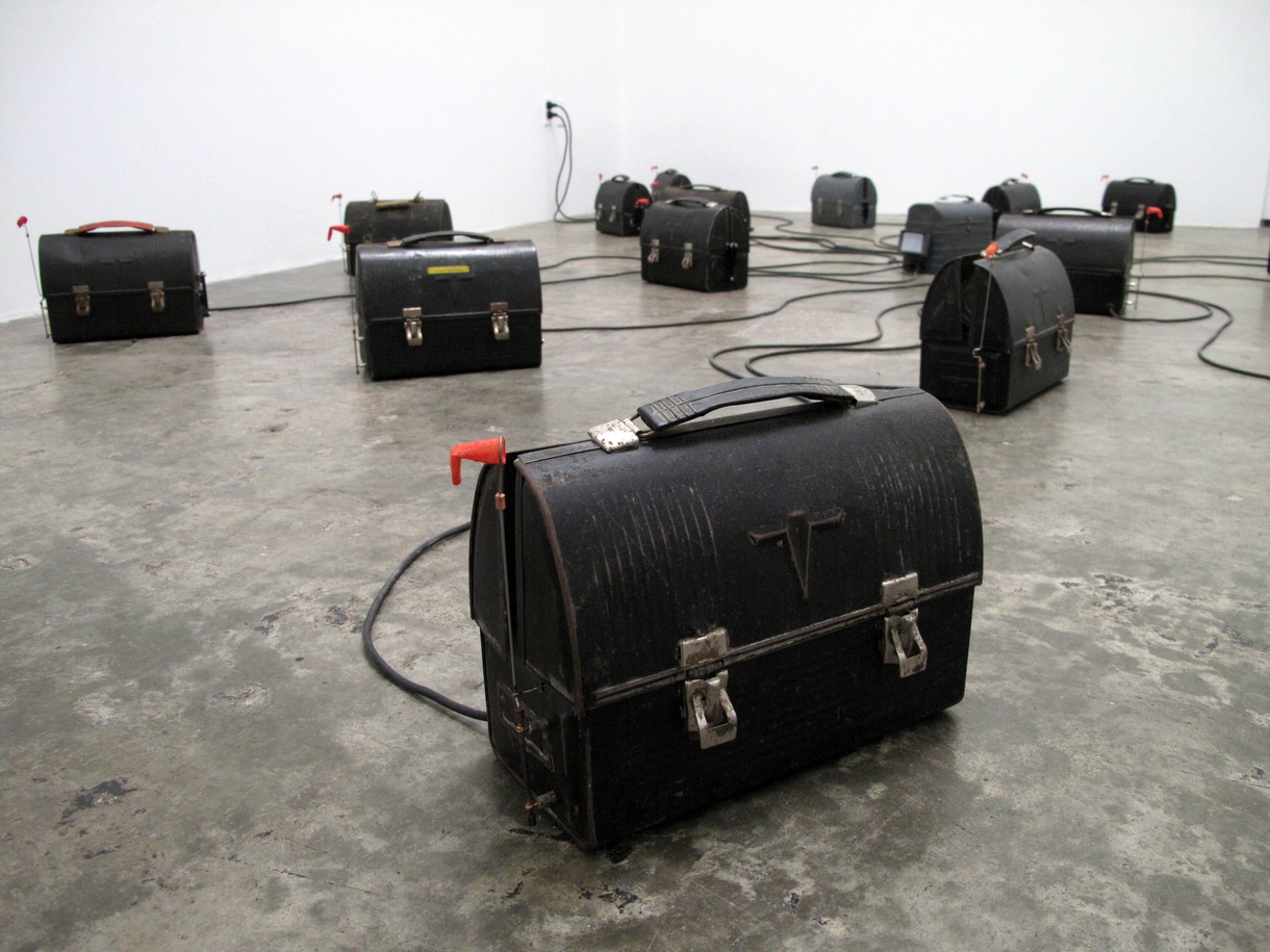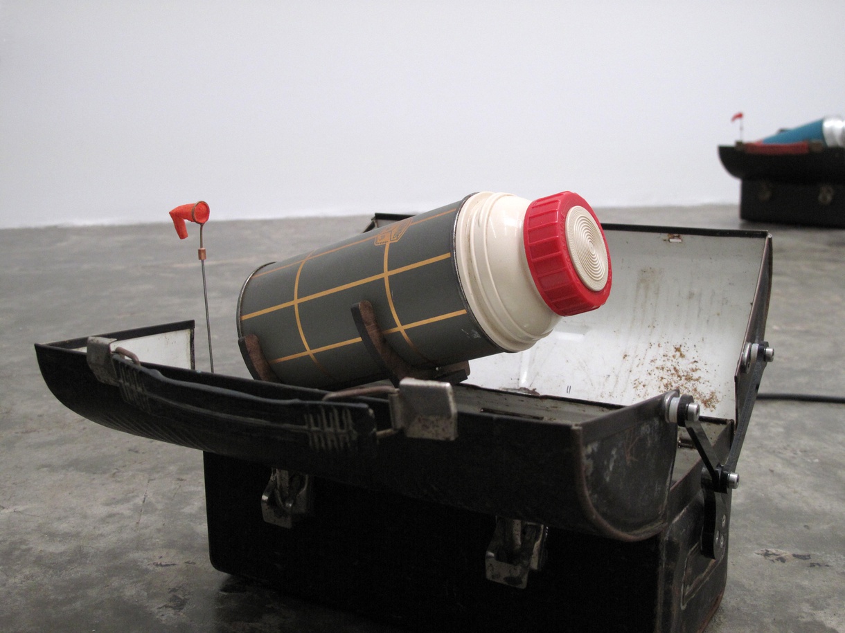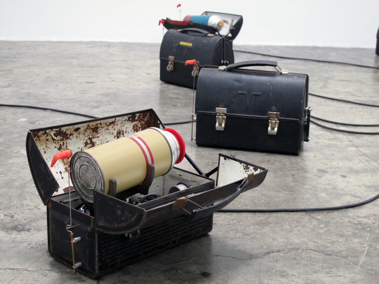 18 lunch pales, thermoses, motors, metal, and cotton.