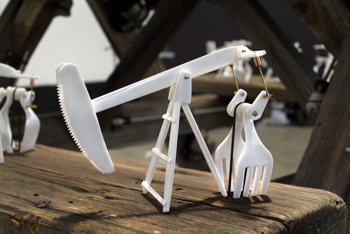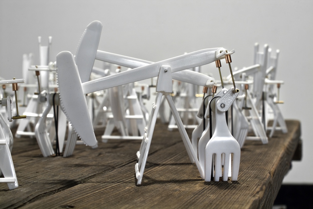 Medium: Picnic table, plastic utensils from Smart & Final, and motors. Dimensions: L 20; x W 15’ x H 11”